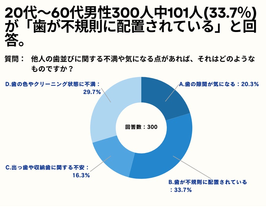 20~60代男性の33.7%が、他人の歯並びに関する不満や気になる点について「歯が不規則に配置されている」と回答。【男性限定_他人の歯並びが気になるかアンケート】