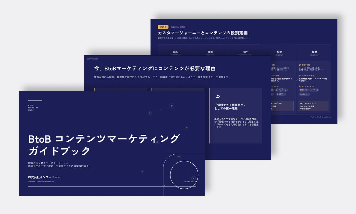 昨今のAI活用やDXの進展により、情報の「量」はあふれていますが、顧客の信頼を勝ち取る「質」の確保はますます困難になっています。インフォバーンは、600社以上の支援実績で培った「編集力」で、リード獲得から商談化、そして長期的なファン化を促すコンテンツマーケティング支援をしています。