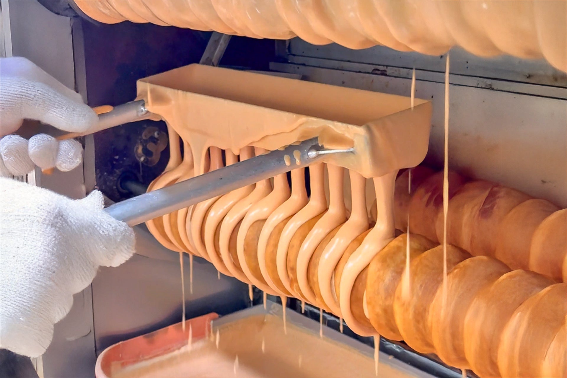 回転する芯棒に生地を巻き付けた後は、成形コームで丁寧に山型に整えます。