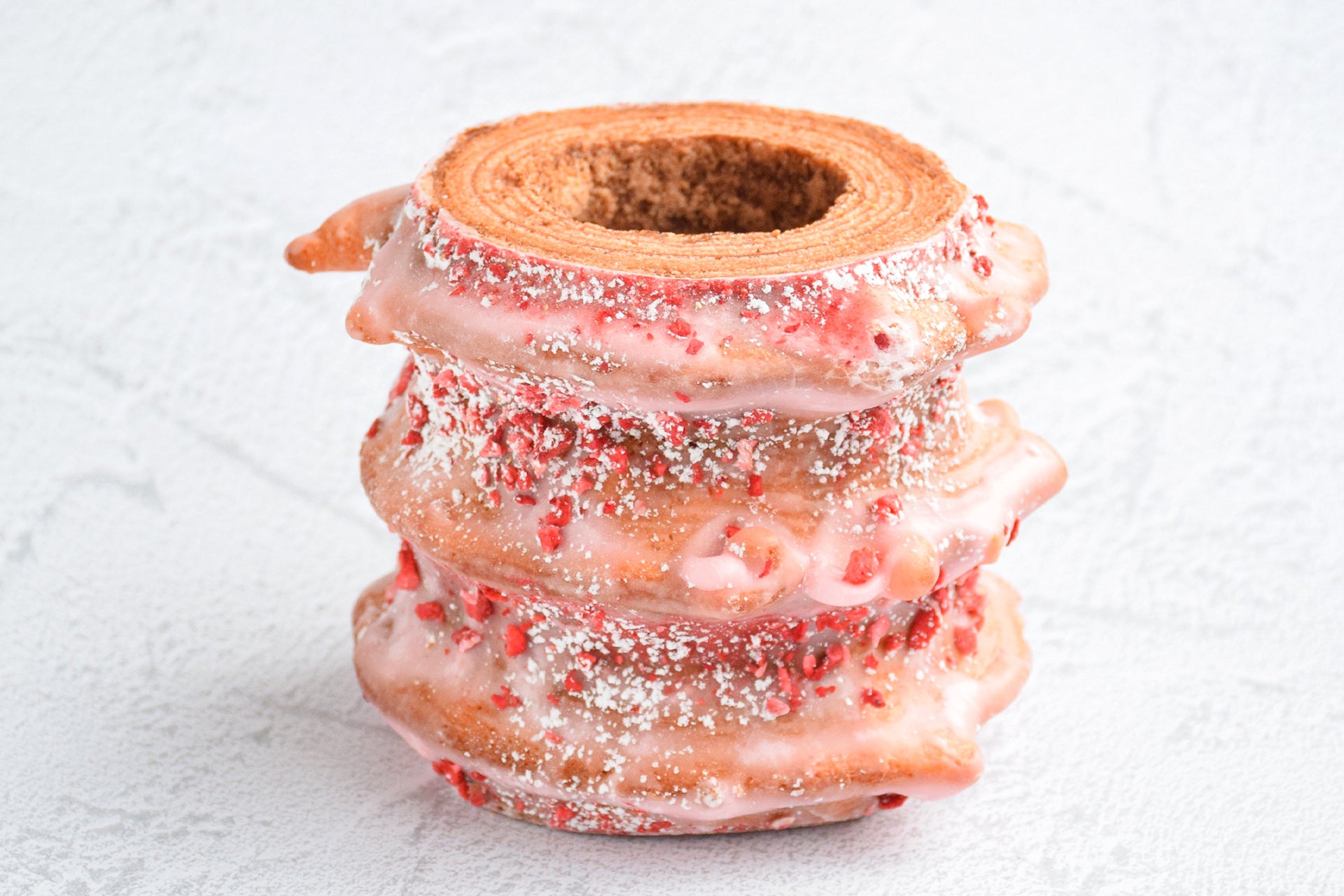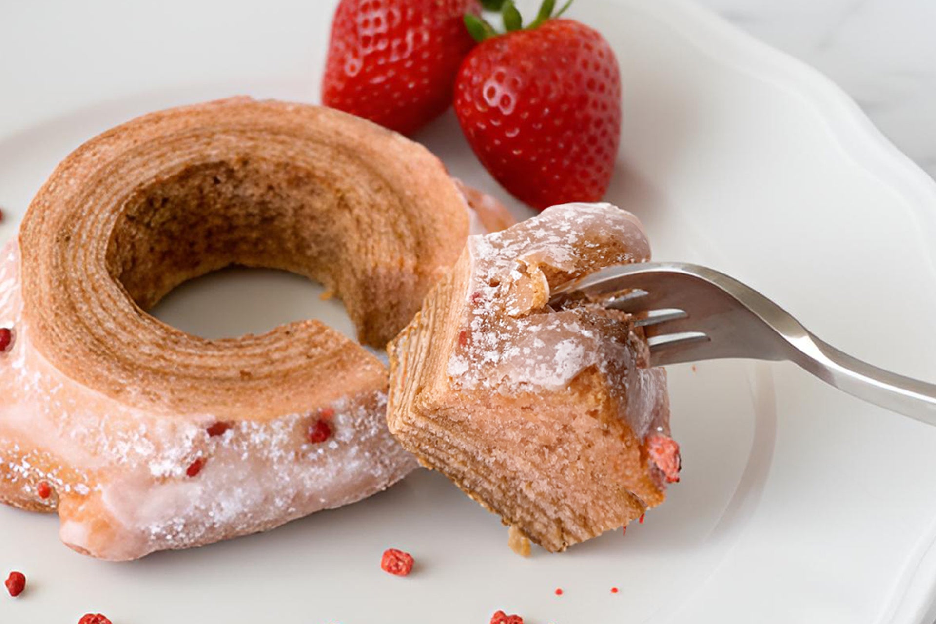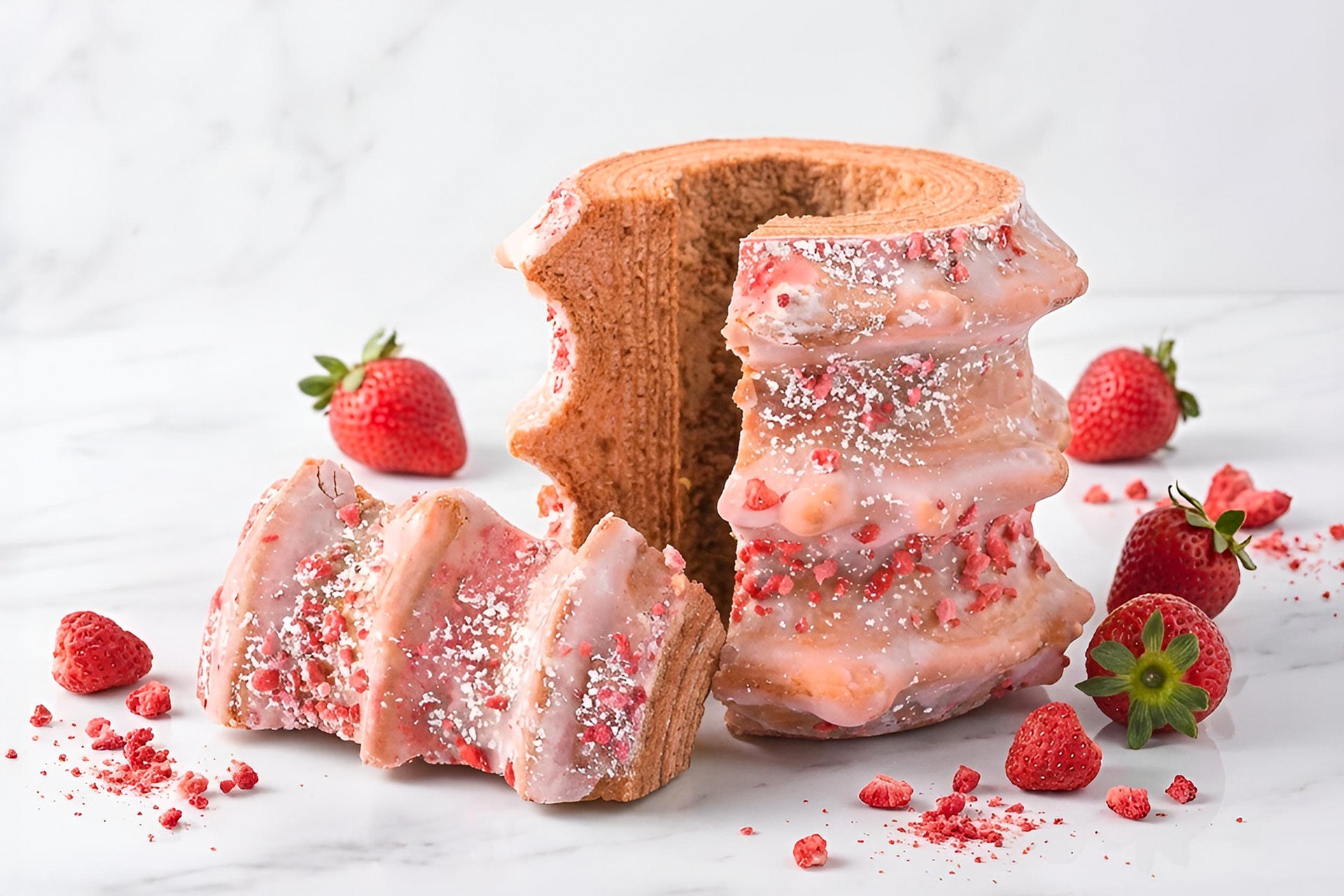 生地とシュガーグラス、それぞれに苺を使うことで、食べる前から香りで、食べ進めるほどに味で感じる贅沢感を演出。苺を“飾り”ではなく、“主役”として活かすためにたどり着いた、今だけの特別なバウムクーヘンです。
