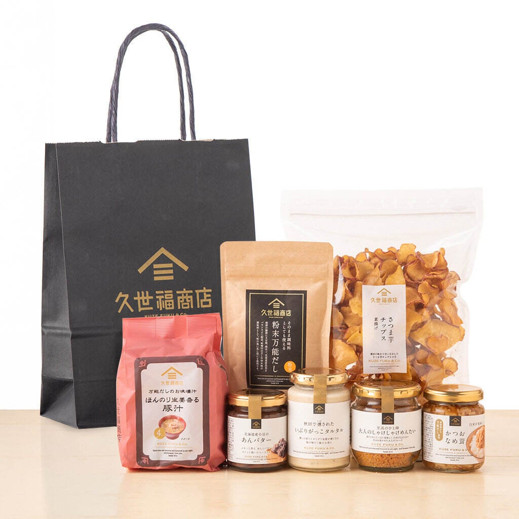 炊きたてごはんにぴったりの「大人のしゃけしゃけめんたい」や、旨みたっぷりの「粉末万能だし」など、久世福商店自慢の逸品を贅沢に詰め込みました。