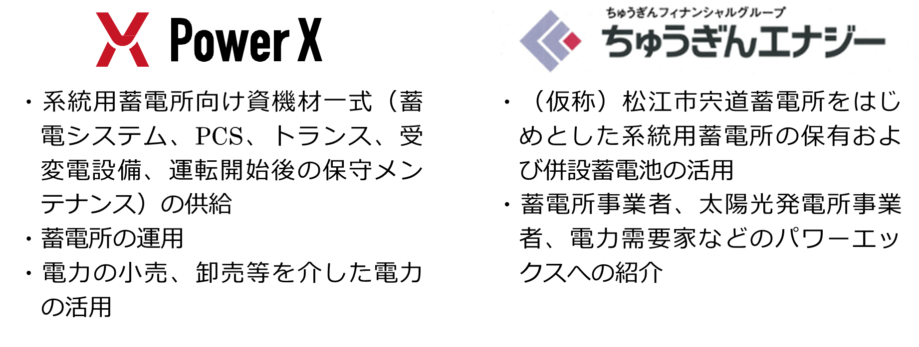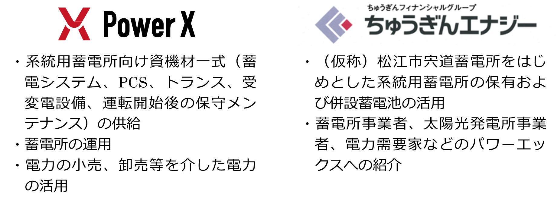本合意書では、当社が進める系統用蓄電所事業に対し、パワーエックスが提供する系統用蓄電池、再エネ併設蓄電池、需要地併設蓄電池などの資機材およびアグリゲーションサービスを活用し、地域における再エネ活用スキームの構築を共同で推進してまいります。