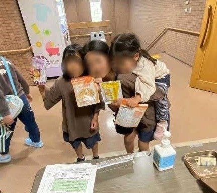 「江東区養育支援課を通じて、地域の支援の必要なこどもたち19名へ、他の食料品と一緒にお渡しさせていただきました。春休みは給食がなく、また自分で食事の用意をしている子どもたちもいるので、袋を開けてすぐに食べられるレトルトパンは助かると思います。区の担当者もとても感謝されていました。配布作業時の写真を送らせていただきます。」