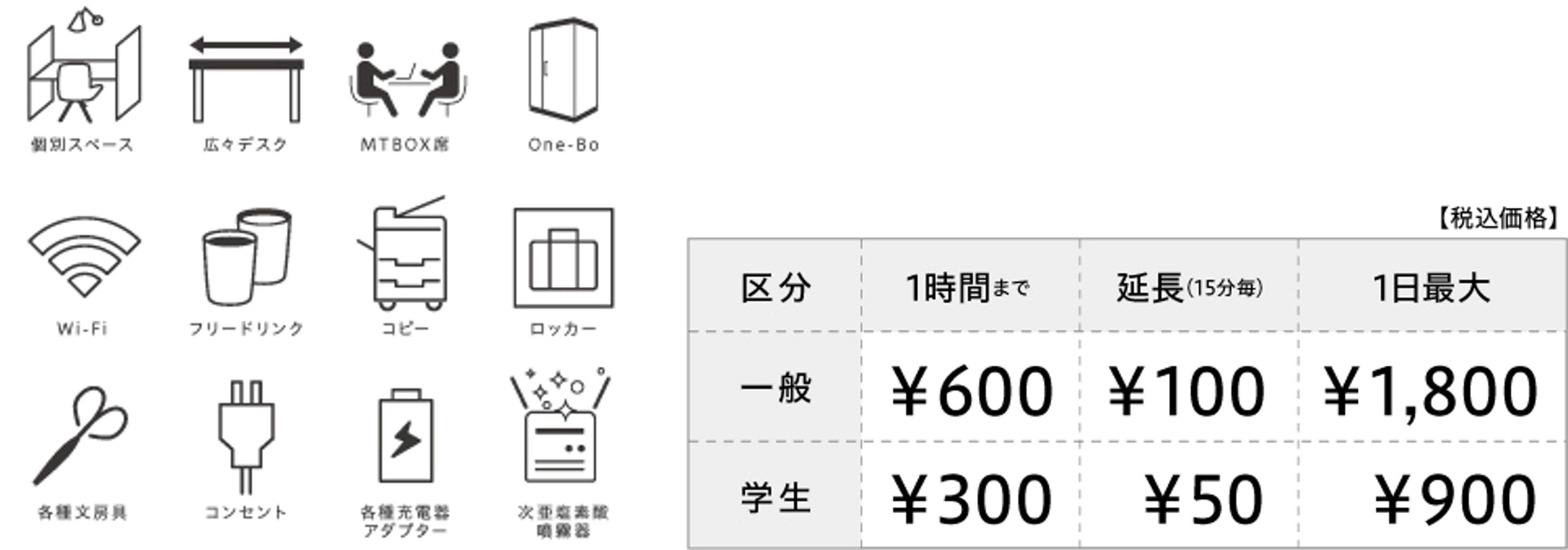 コンセプトは「読書に、仕事に、勉強に。使い方はあなた次第。自分時間を大切にする人の、お気に入りの場所」。本の持ち込みができるだけでなく、オンライン会議や勉強なども可能です。WiFiやコピーなどの基本的な機能はもちろん、フリードリンクや個別スペースもあり、1日中仕事をしても快適な空間です。
