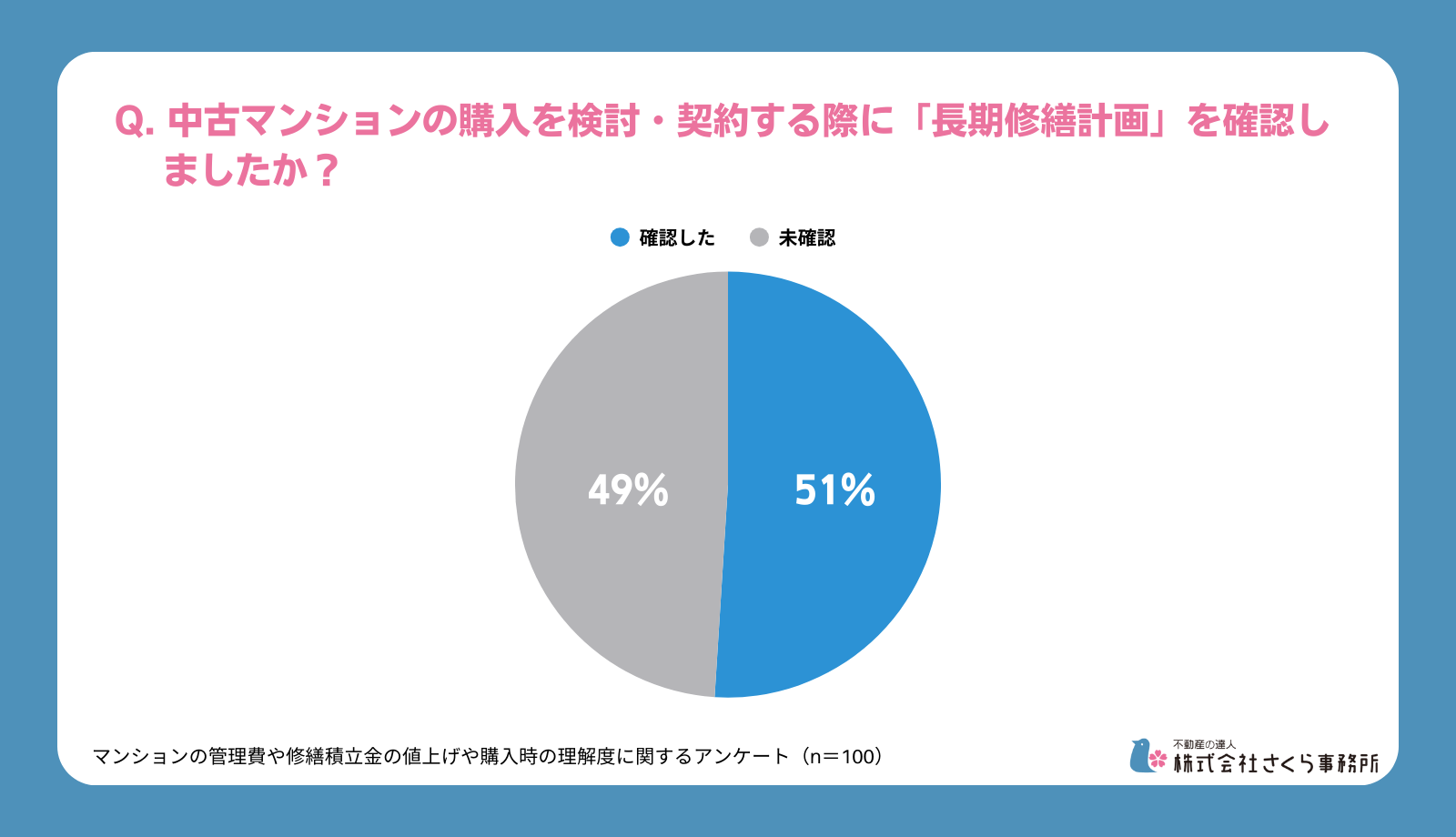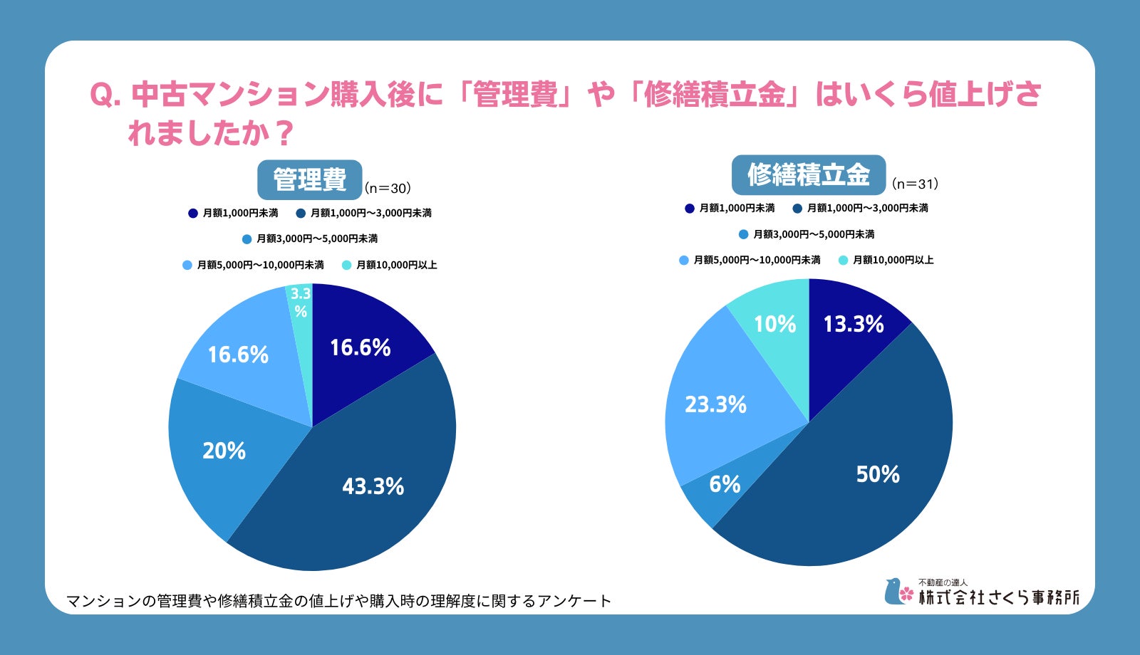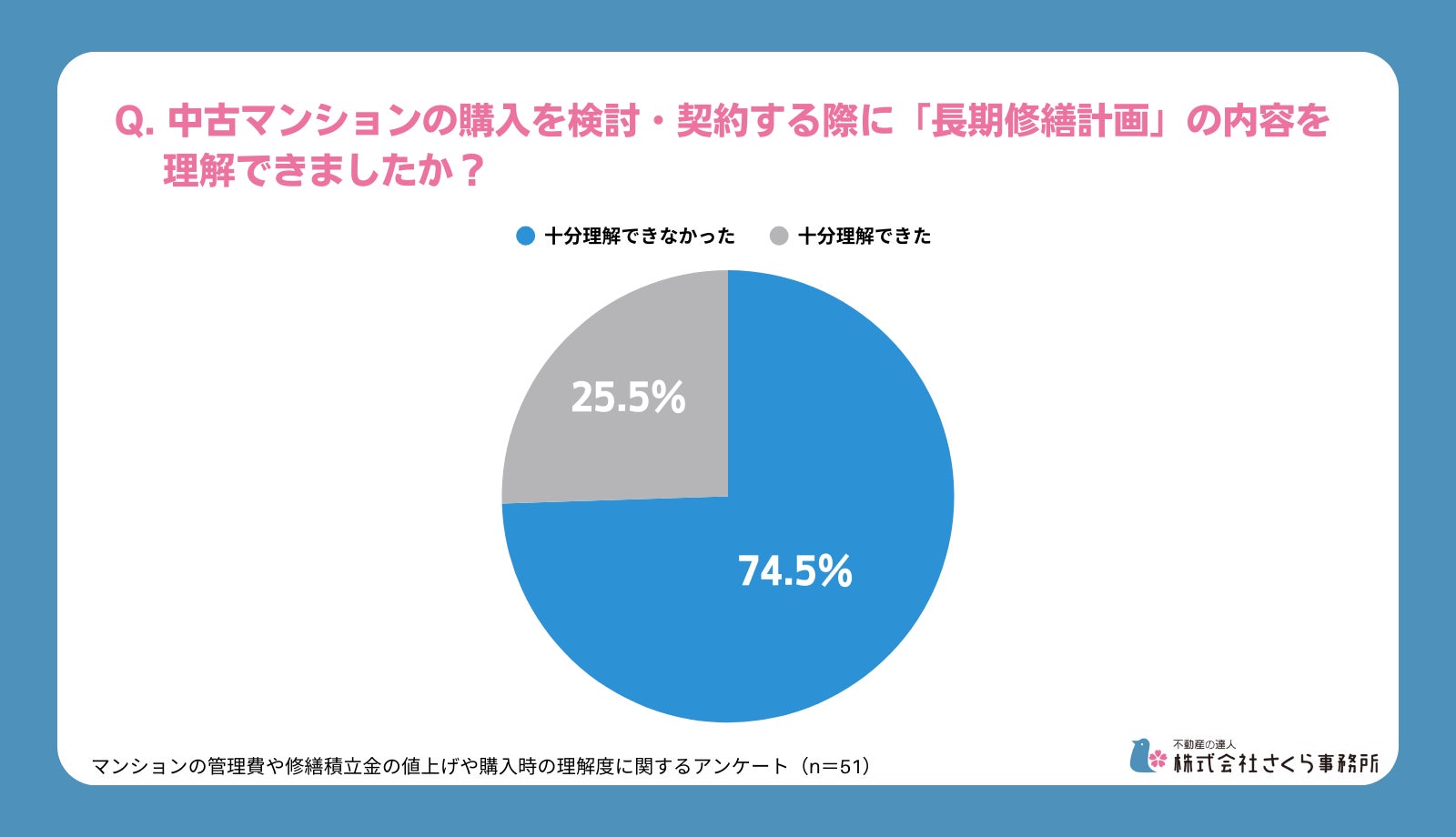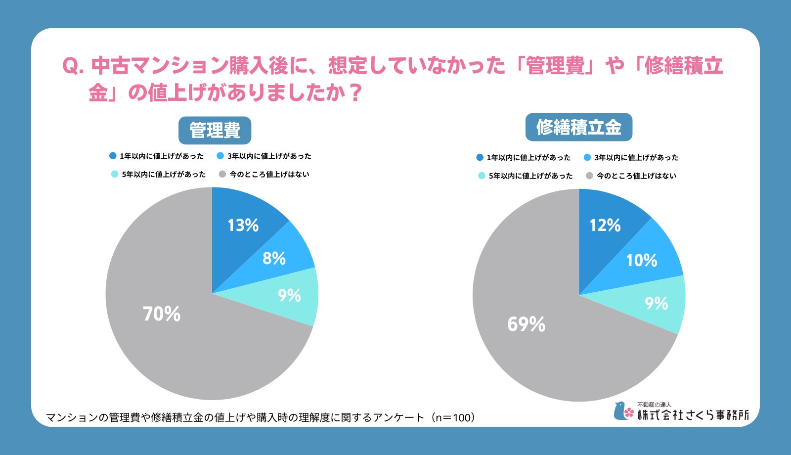 個人向け総合不動産コンサルティング・ホームインスペクション(住宅診断)、マンション管理組合向けコンサルティングを行う“不動産の達人 株式会社さくら事務所”(東京都渋谷区/社⻑:大⻄倫加)は、中古マンションを購入した方を対象に、マンションの管理や修繕積立金の値上げや購入時の理解度に関するアンケートを実施しました。本件に関する取材やご質問がございましたらお気軽にお問い合わせください。