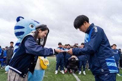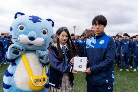 大会初日である3月23日(土)には、能登地区の高校サッカー部へ向けて、CHINTAIイメージキャラクターを務める「僕が見たかった青空」の吉本此那さんと公式マスコットキャラクター・チンタイガーから、激励金と活動物品の贈呈いたしました。