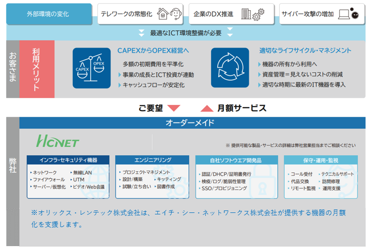 エイチ・シー・ネットワークスは、ネットワークインテグレータであると同時にセキュリティ関連ソフトウエアの開発を行うメーカー機能も擁しています。自社開発のノウハウを生かした強固なセキュリティ対策などのサービスをあわせて提供することでお客さまへ最適なシステム構築を支援しています。オリックス・レンテックは、ネットワーク関連機器をはじめとしたレンタル機器の運用管理で培ったノウハウを生かし、お客さまの多様なニーズに対応しています。