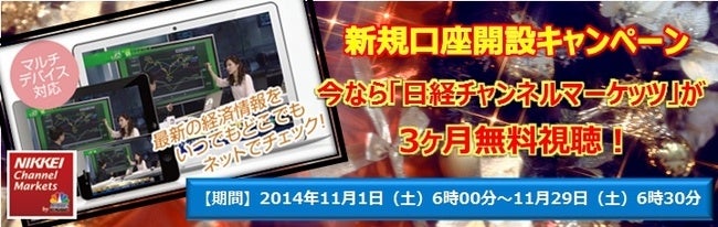 当社では2014年11月1日(土)より新規に口座開設頂いたお客様を対象に、「日経チャンネルマーケット」が最大で3ヶ月間無料で視聴頂けるキャンペーンを実施いたします。