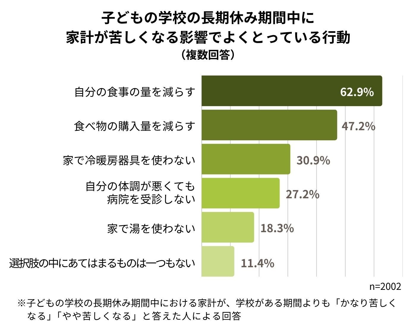 回答者の多くは日頃から経済的に困難な生活を送っており、長期休み期間中における家計負担の増加は、暮らしに一層深刻な影響を及ぼします。本調査結果においてとりわけ目立ったのは、子どもに食べさせるため、保護者自身が食事を削る実態です。学校の長期休み期間中における家計が「かなり苦しくなる」「やや苦しくなる」と答えた回答者に対し、同期間中に家計が苦しくなる影響でよくとっている行動について質問したところ、「自分(子どもの保護者)の食事の量を減らす」が最も多い割合を占めました(複数回答)。