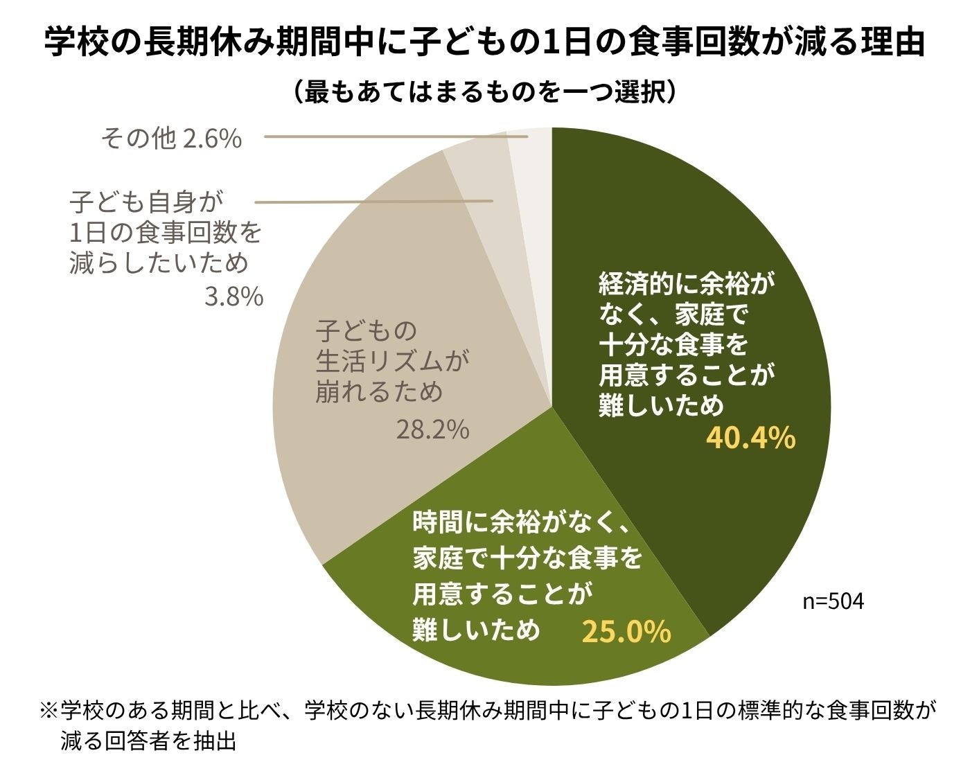 加えて、長期休み中における子どもの1日の食事回数が学校のある期間よりも減るという回答者に対し、その理由を質問したところ、「経済的に余裕がなく、家庭で十分な食事を用意することが難しいため」が最も多い割合を占めたほか、3割近くが「時間に余裕がなく、家庭で十分な食事を用意することが難しいため」と答えました。