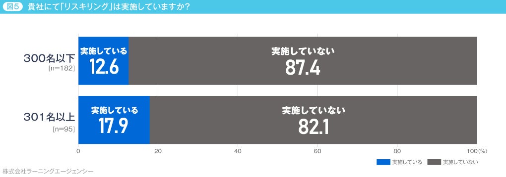結果、リスキリングを取り組んでいる企業は、300名以下では12.6%、301名以上では17.9%という結果となりました。まだまだ取り組みは進んでいない状況であることがわかりました。(図5)
