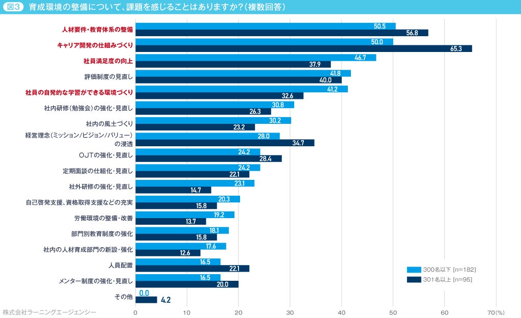 一方、「社員満足度の向上」「社員の自発的な学習ができる環境づくり」は300名以下が301名以上よりも約9ポイント高くなり、4割超が課題を感じている結果となりました。(図3)