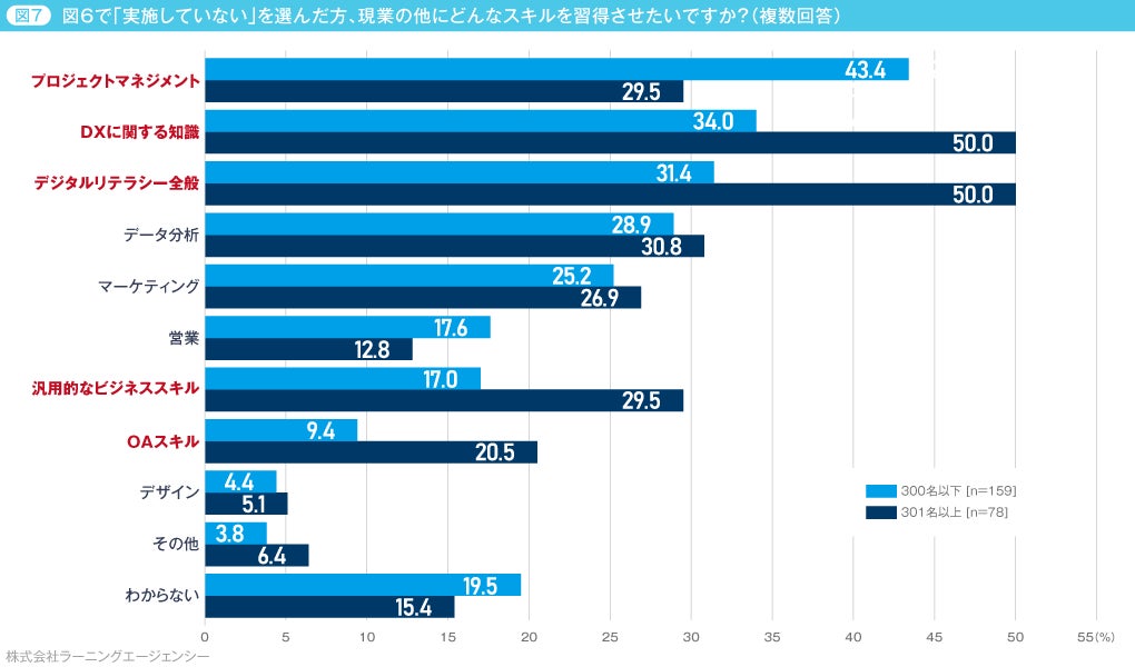 一方、まだリスキリングに取り組んでいない企業は、現場の社員にどのようなスキルを習得させたいと考えているのでしょうか。300名以下では「プロジェクトマネジメント」が43.4%と、301名以上よりも13.9ポイント高い結果となりました。301名以上では、「DXに関する知識」「デジタルリテラシー全般」が50.0%となり、300名以下よりも約20ポイントも高い結果となりました。また、「汎用的なビジネススキル(29.5%)」や「OAスキル(20.5%)」も300名以下よりも10ポイント以上高い結果となりました。(図7)