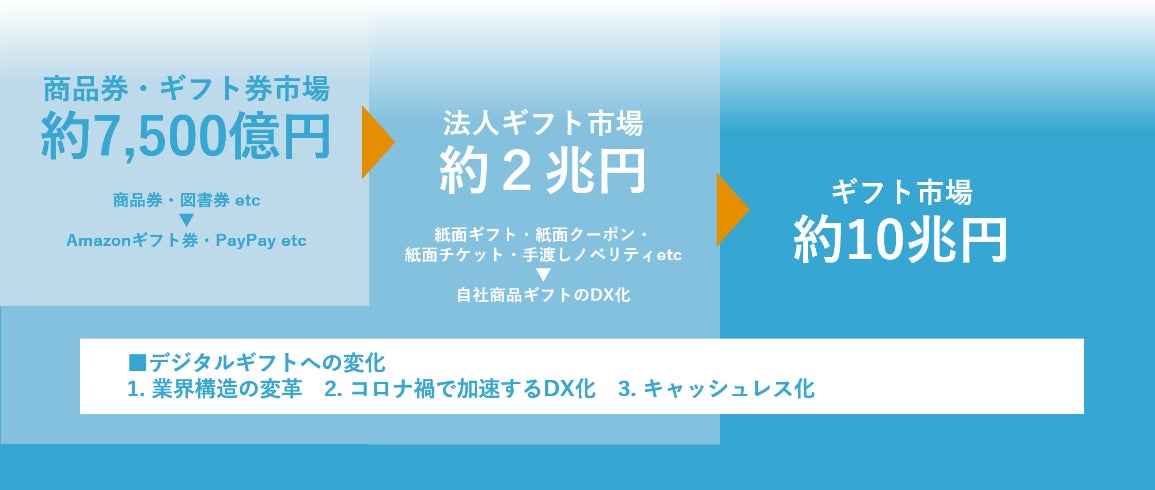 従来のギフト券はもちろん、キャッシュレス化・コロナ禍によって著しく進むDX化に伴う未来のギフト・マネーサービスにも随時対応、約10兆円の国内ギフト市場を網羅していきます。