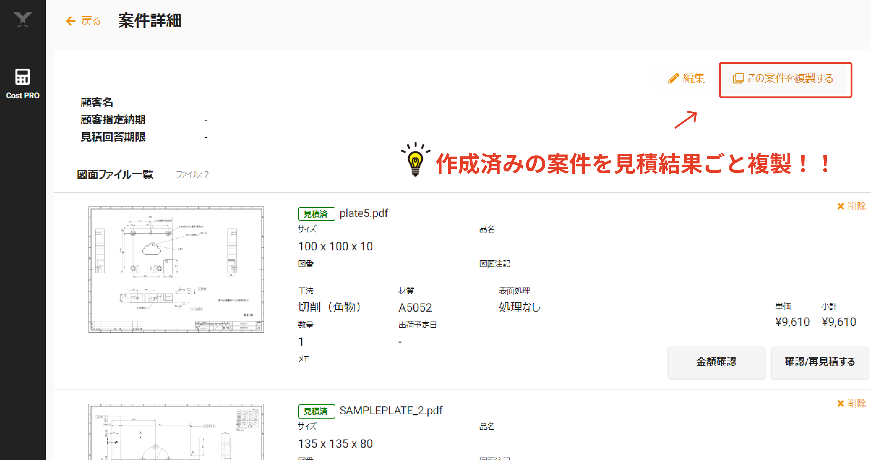 指定した加工形状や入力した数値、見積結果を含めた全ての内容が複製され、リピート案件や一部の図面改訂があった案件も、案件名や納期等の変更のみで新しい案件として作成することができます。