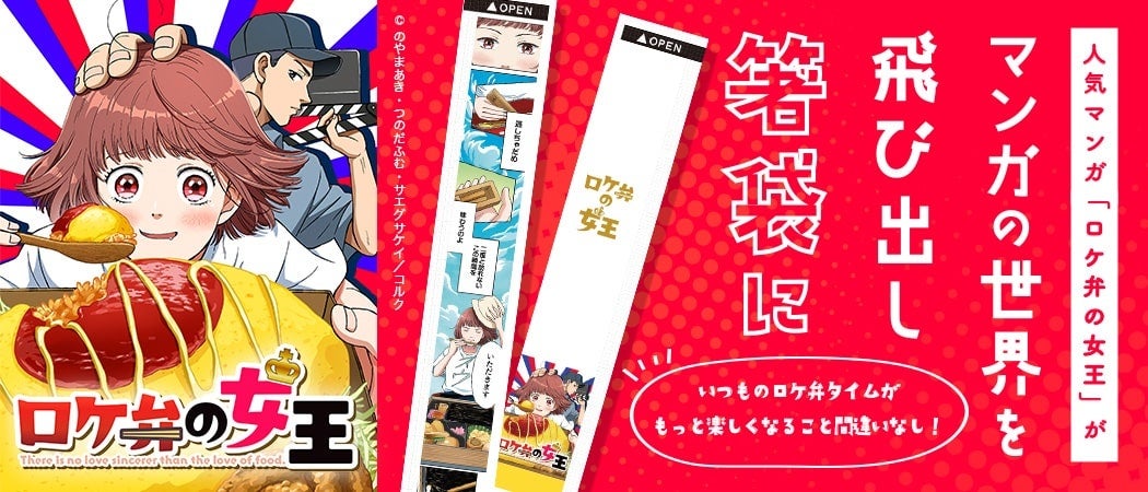 LINEマンガで連載中の「ロケ弁」をテーマにした史上初の漫画「ロケ弁の女王」とコラボしたオリジナル箸袋を制作しました。6月10日のロケ弁当の日にちなんで、合計61,000膳配布します。