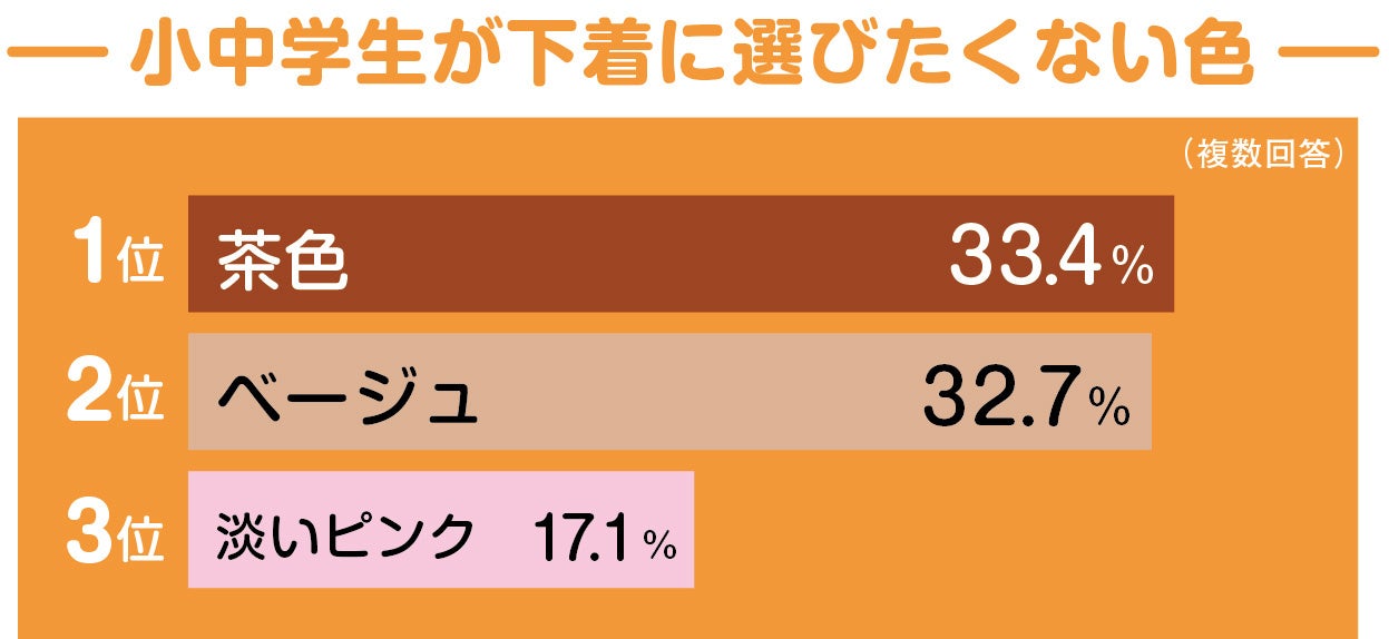 下着に選びたくない色(ビビッドカラーを除く)を複数回答可で聞いたところ、33.4%が「茶色」32.7%が「ベージュ」を挙げました。茶色もベージュも白シャツに透けにくいカラーであり、特にベージュは婦人の下着では一般的に透けにくいカラーとして認識されていますが、小中学生には好まれにくいことが分かります。