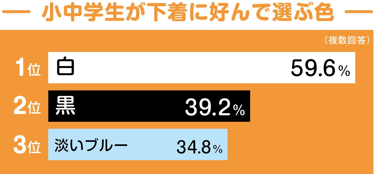 下着に好んで選ぶ色を複数回答可で聞いたところ、多い順に白が59.6%、黒が39.2%、淡いブルーが34.8%でした。いずれも制服のブラウスや体操着から透けやすいカラーですが、小中学生が好んで選ぶ色であることが分かります。