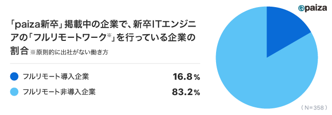 今回の調査では、2022年7月現在「paiza新卒」に掲載されている358社のうち60社(16.8%)が新卒ITエンジニアの「フルリモートワーク」を実施していることが分かりました。