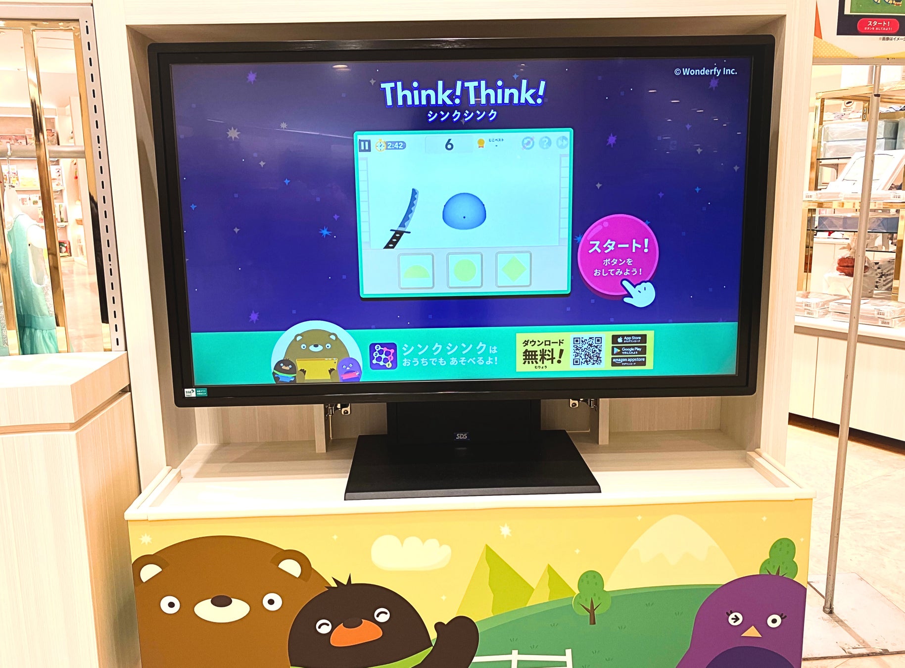 店舗に設置されたディスプレイで、知育コンテンツに無料で挑戦できます。思考力が育つ土台となる5分野(空間認知・平面認知・試行錯誤・論理・数的処理)を網羅的に楽しみながら学べる知育アプリ「シンクシンク」の中から、お子さまに大人気の問題を厳選して収録してあります。