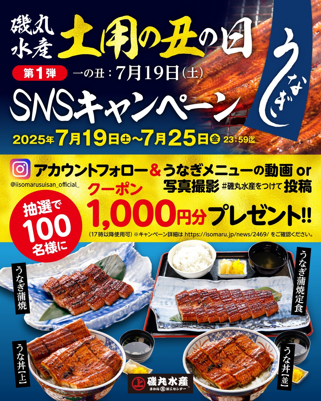 【7月19日(土)土用の丑の日】抽選で200名様に「磯丸水産」の1,000円クーポンが当たる!SNSキャンペーン第一弾開催!