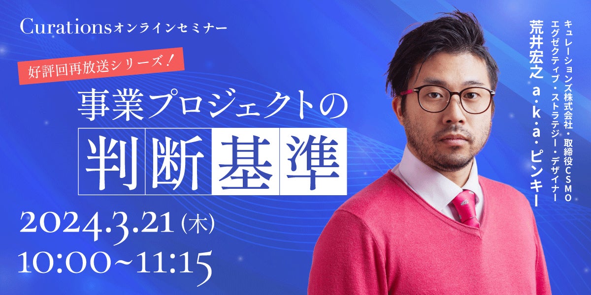 顧客企業のビジネス変革を成功に導くキュレーションズ株式会社(本社:東京都渋谷区、代表取締役社長:根本隆之、以下当社)は、『事業プロジェクトの判断基準(好評回再放送シリーズ!)』を2024年3月21日(木)に開催いたします。