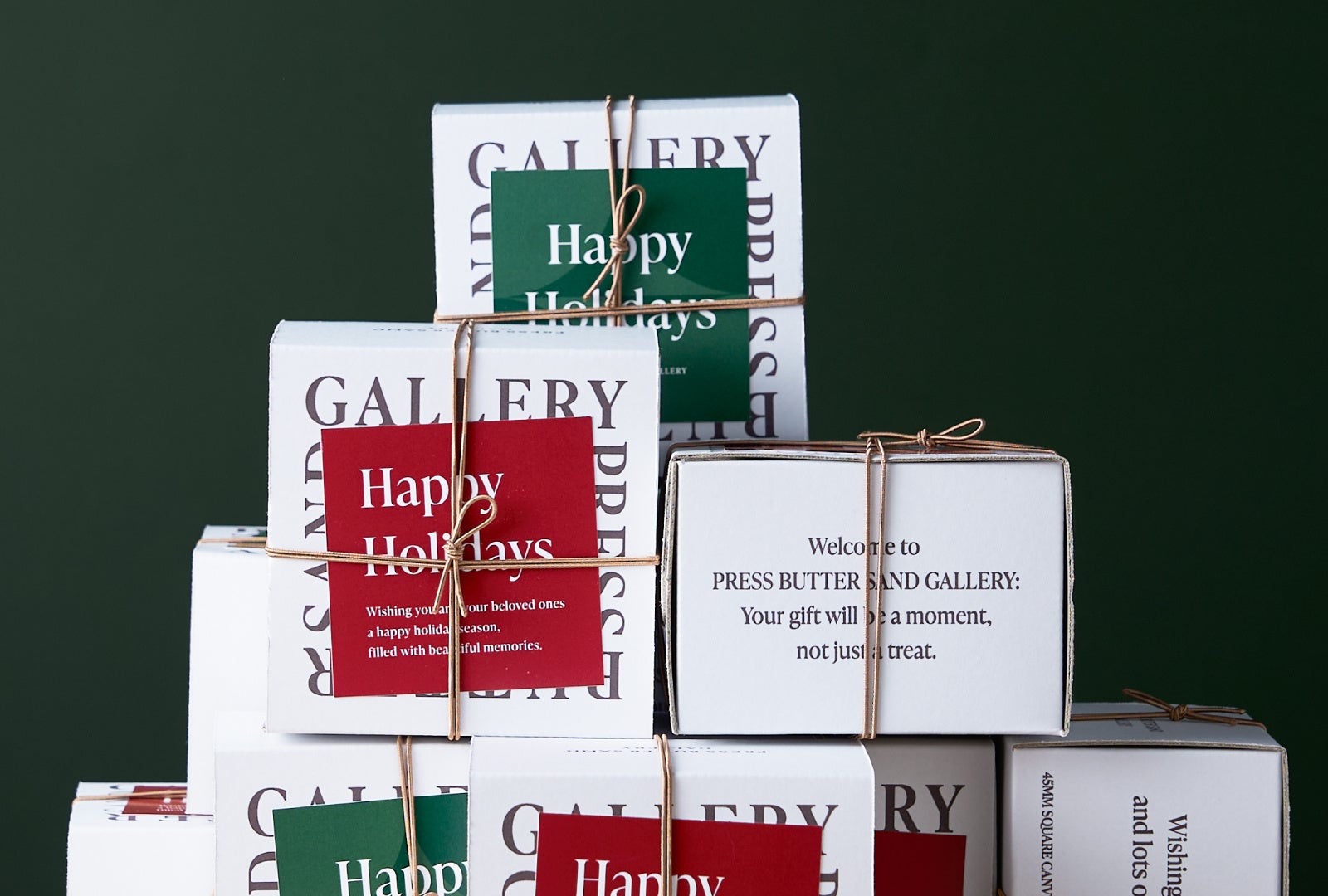 プレスバターサンドギャラリーは、感性を刺激するお菓子を生み出すための実験・実践の場です。バターサンドの象徴的な形状である 45mm×45mm の正方形をキャンバスに見立て、その中で出来うる限りの表現に挑戦し、プレスバターサンドの新たな領域を探ります。ダイナミック、ユーモア、独創的。それぞれのバターサンドが持つ個性は違えど、通底しているのは自由な精神と、それを下支えする製菓の技術。