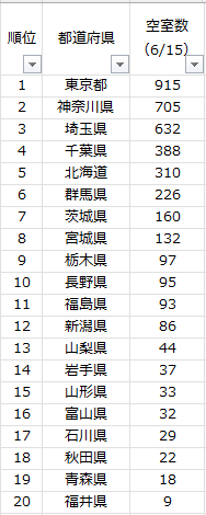 関東ではほとんどの都県が3桁の空室数を有する一方、13位の山梨県以下は50室以下となっています。