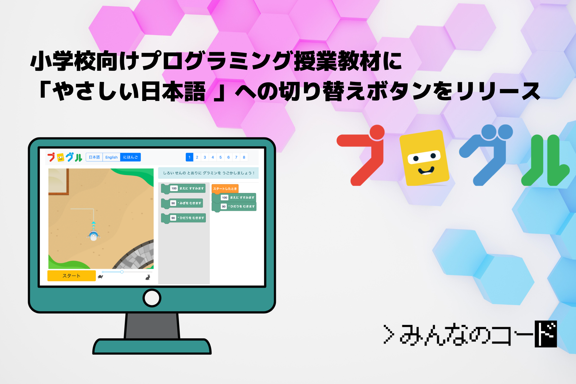 特定非営利活動法人みんなのコード(神奈川県横浜市、代表理事:利根川 裕太、以下みんなのコード)は、「誰もがテクノロジーを創造的に楽しむ国にする」をビジョンに掲げ、小学校のプログラミングの授業で使える教材「プログル」や、教員研修を無償提供することで、全国の先生方をサポートしてきました。このたび、みんなのコードは「プログル多角形コース」に、「やさしい日本語 *1」への切り替えボタンを追加しました。さらに、授業を行う先生方・子どもたちの進め方のヒント「手元ガイド」も公開しています。