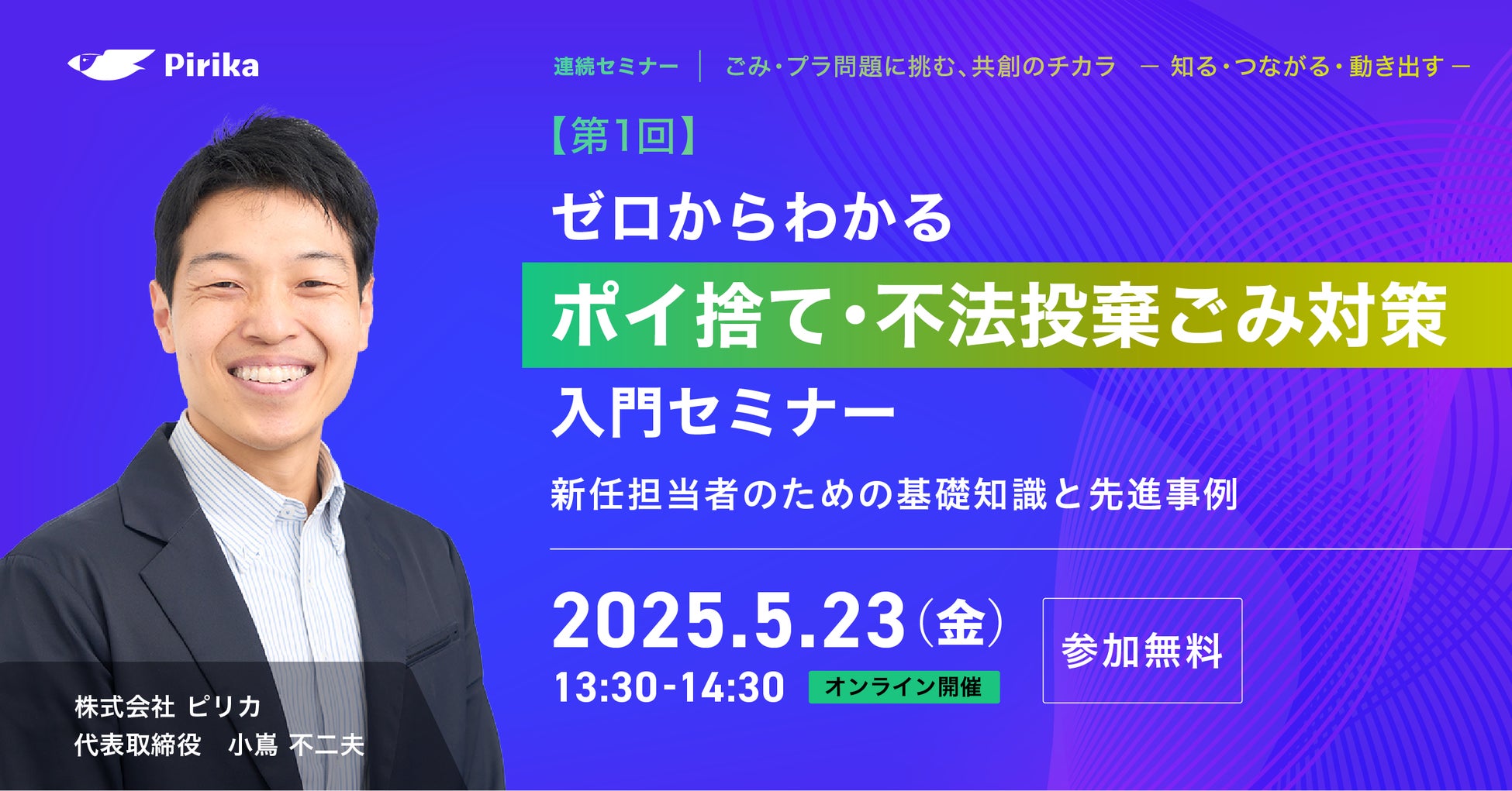 科学技術の力であらゆる環境問題を克服することを目指す株式会社ピリカ(東京都渋谷区、代表取締役:小嶌 不二夫 以下、ピリカ)は、「ごみ・プラ問題に挑む、共創のチカラ ー知る・つながる・動き出すー」をテーマに2025年5月より連続セミナーをスタートいたします。