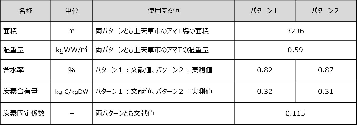 アマモの年間CO2吸収量を実測値から算定し、文献値から算定した場合と比較して、結果に差があるか検証しました。文献値と実測値で、使用するアマモには以下の差があります。