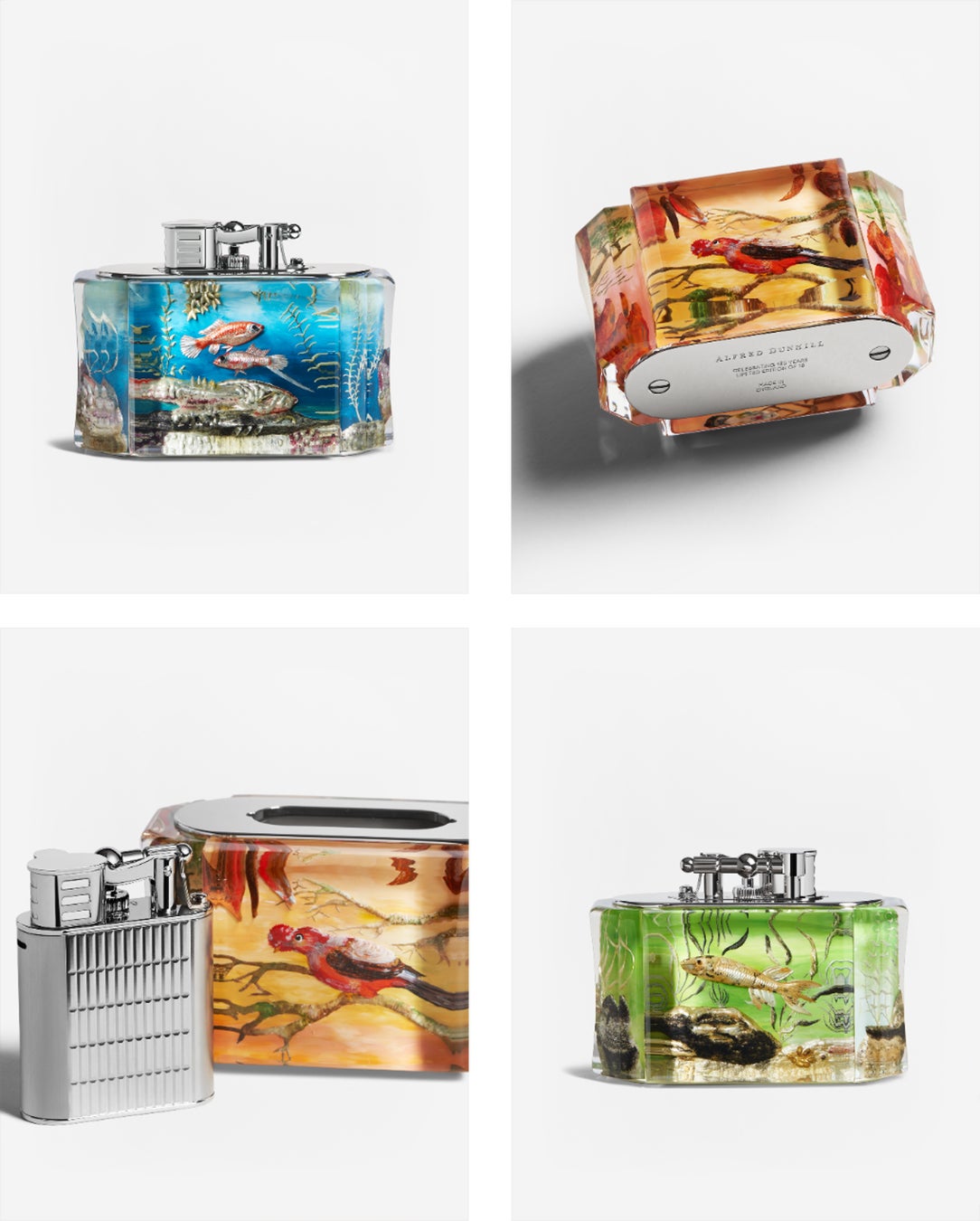 1949年に初めて発売されたアクアリウム ライターには、2つとして同じものがありません。4枚のパースペックスを組み合わせたハンドメイドのアクアリウム ライターは、リバースインタリオと呼ばれる高度な技法を駆使し、彫刻や彩色がひとつひとつ精巧に施されています。魚や自然をモチーフにしたものが多く、アクアリウムという名前は、パースペックスの光の反射が水の奥行きやゆらぎに似ていることに由来しています。