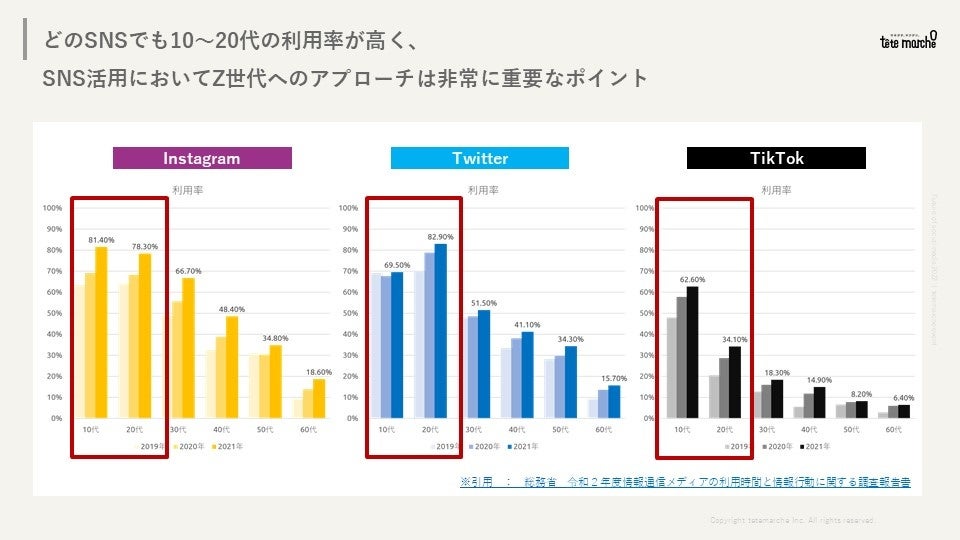 まず川又は、Z世代の消費行動を語るにあたり、どのSNSでも10~20代の利用率が高く、SNS活用においてZ世代へのアプローチは企業担当者にとって非常に重要なポイントになることを話しました。