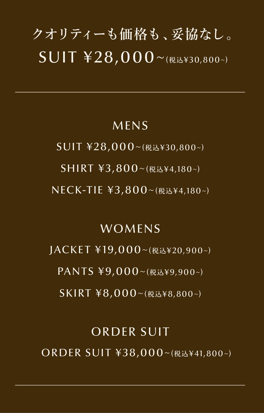 大切な仲間たちに対して、いつも正直でありたい。その想いは、お客様に対する製品の価格設定においても徹底してきました。すべては「 ほかにない、ONLY だけの確かなスーツ」をつくりつづけるために。
