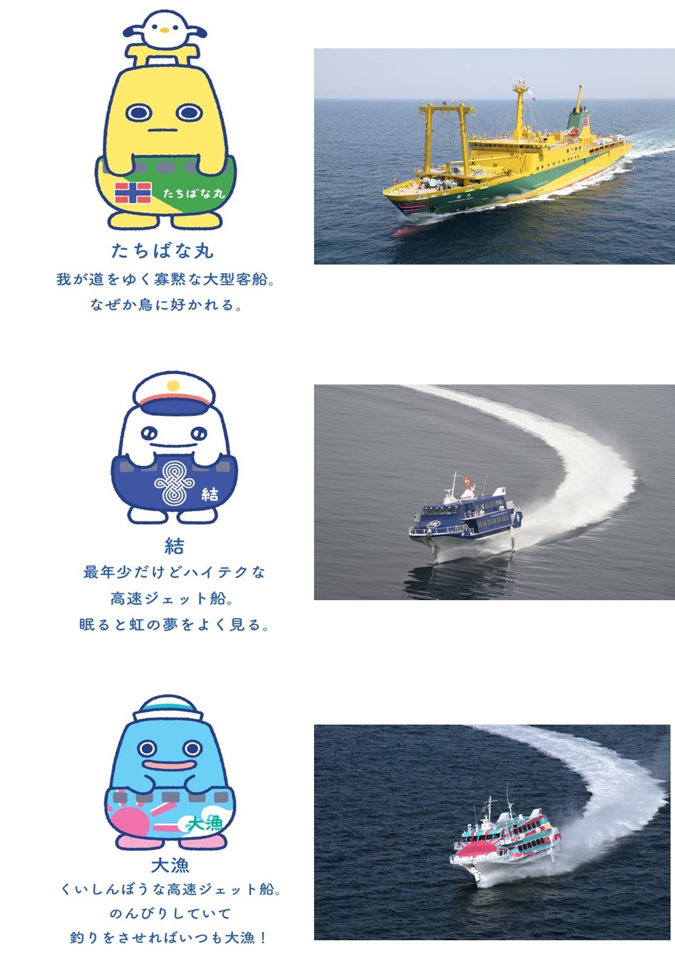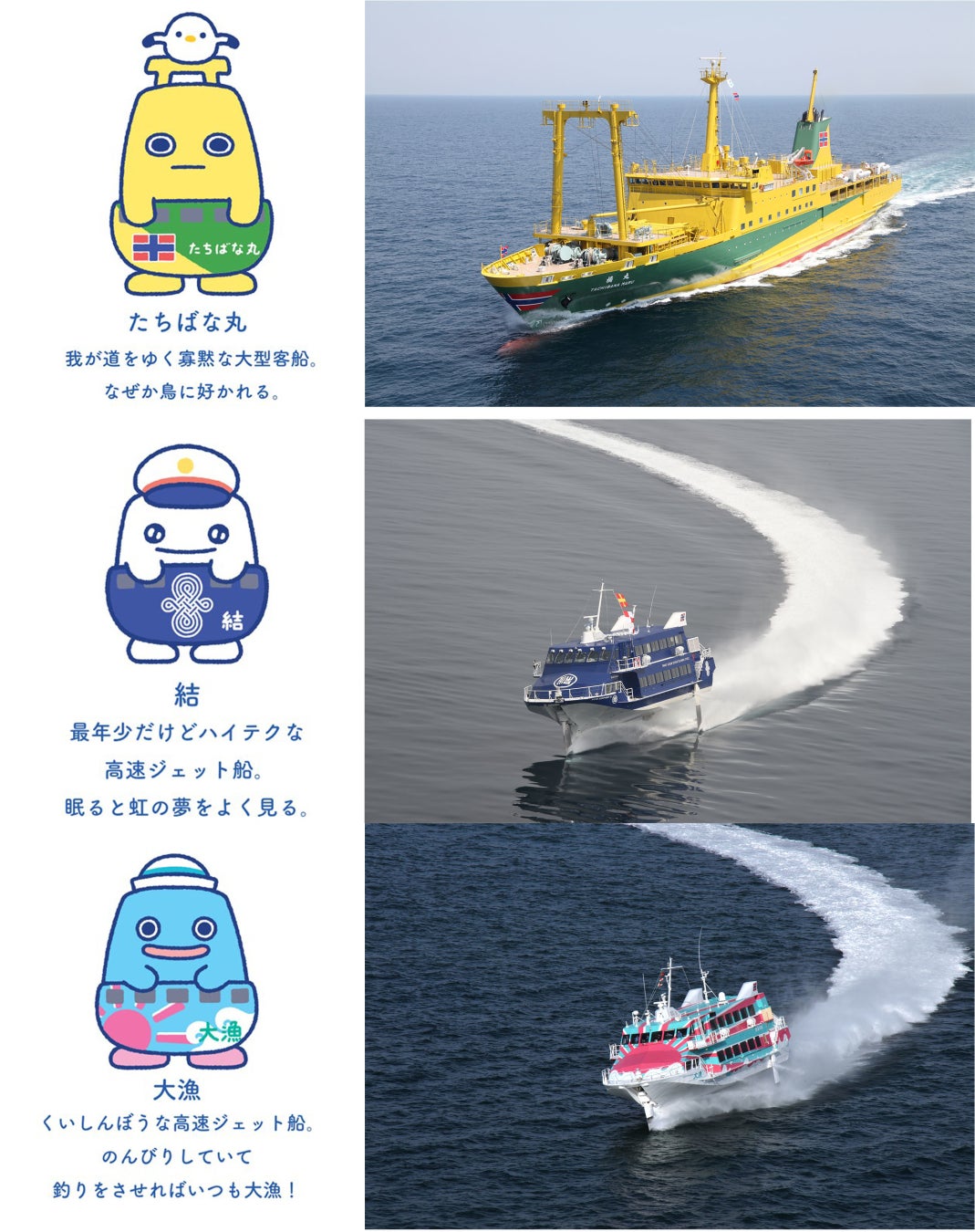 2隻の貨客船(大型客船)と4隻の高速ジェット船を所有しており、本土と島、人と人を繋ぐ架け橋として毎日運航しています。