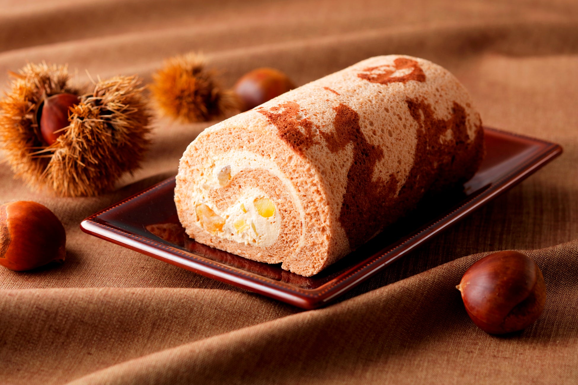 キャラメルとココアの2色の生地をマーブル状に焼き上げ、キャラメルクリームとマロングラッセ、栗甘露煮をやさしく巻きました。秋を感じる季節限定のロールケーキです。