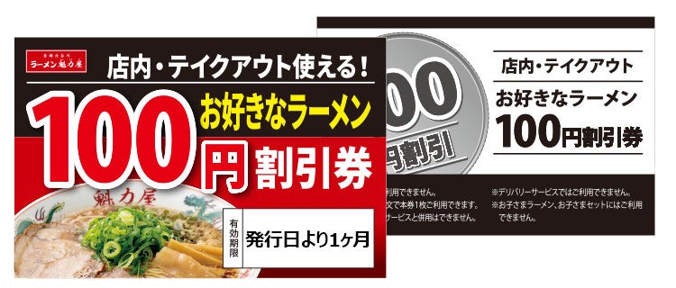 魁力屋では「お好きなラーメン100円割引券」を配布しています。