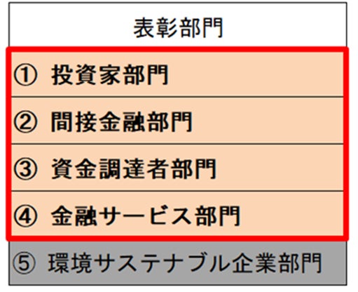 本アワードは、以下の5部門に分かれており、こちらは『①投資家部門、②間接金融部門、③資金調達者部門、④金融サービス部門』についての募集をお知らせするものです。