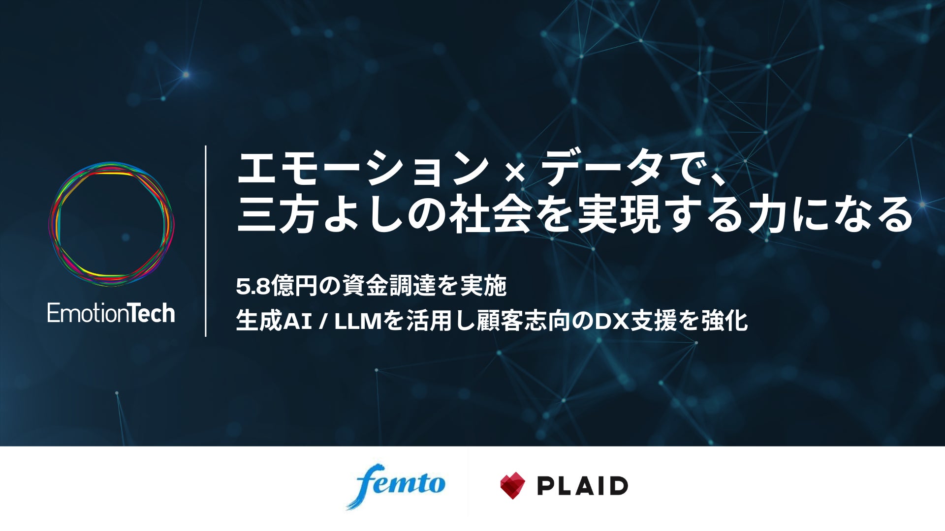 この度、フェムトパートナーズは、エモーションテックへ投資させていただきました。カスタマーエクスペリエンス領域を収益性向上の優先課題と位置づける企業は増加しており、また、社会使命であるESGの観点において、人的資本の文脈で従業員エクスペリエンス領域は注目を集めています。エモーションテックが当該領域に切り込み、マーケットをリードする企業になることを、我々は確信しています。また、既存プロダクトにAI分析サービスを掛け合わせ、顧客感情データのより深い解析とアクション策定を可能とし、今後更に付加価値の高いソリューションを提供することを期待しています。エモーションテックの今後の更なる成長を最大限応援してまいります。