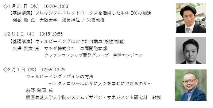 基調講演では大阪大学の関谷 毅 氏、マツダ株式会社の久保 賢太 氏を迎え、フレキシブルエレクトロニクスや自動車業界におけるウェルビーイング視点の開発と最新動向についてご講演いただきます。またウェルビーイング研究の第一人者、慶應技術大学大学院の前野 隆司 氏より、ウェルビーイングを陽に考慮した製品やサービスの設計法について、人々を幸せにする家、地域作り、AI、教育などの具体的なデザイン事例と合わせてお話しいただきます。