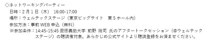 2月1日(木・会期2日目) 16時より会場内にて業界関係者によるネットワーキングパーティーを実施いたします。業界を牽引する研究者やウェルビーイングな製品・サービス開発に取り組む企業・団体との、新たなビジネスチャンスやコラボレーションの可能性が広がる場として、異業種・異職種間の交流を促進します。