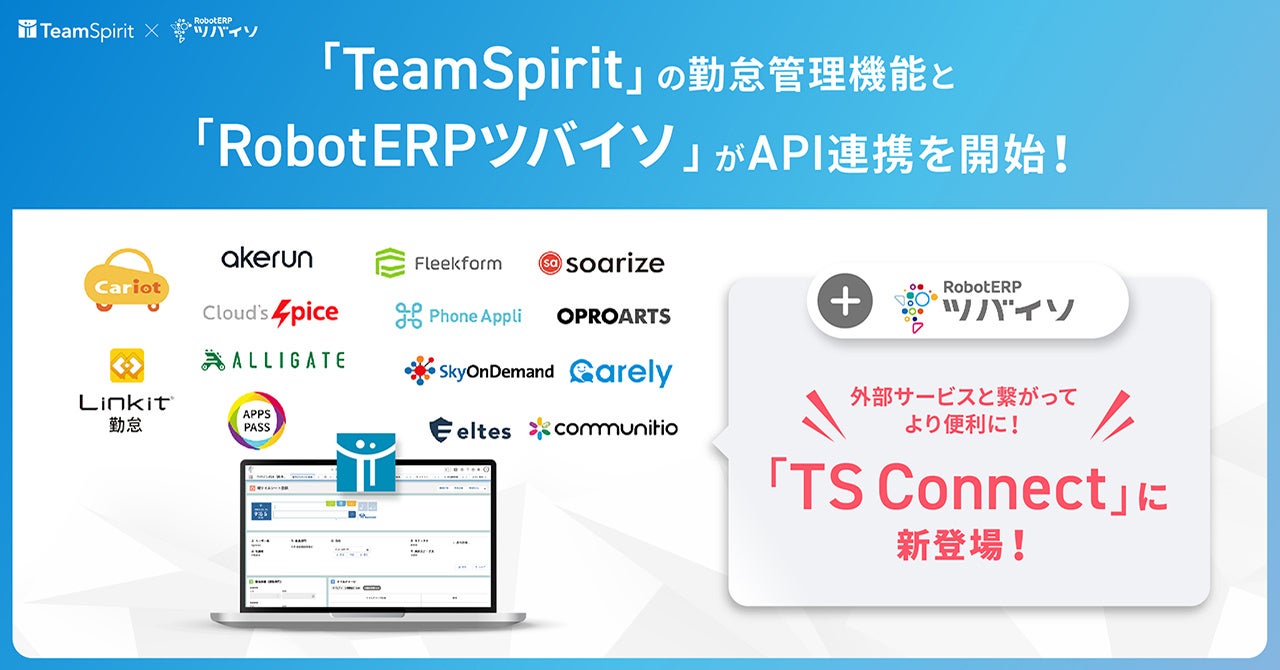 働き方改革プラットフォーム「TeamSpirit」シリーズを開発・提供する株式会社チームスピリット(代表取締役:荻島 浩司、 以下 チームスピリット)は、「TeamSpirit」の勤怠管理機能とツバイソ株式会社(本店:東京都渋谷区、代表取締役:印具毅雄、以下ツバイソ)が提供する「RobotERPツバイソ」のAPI連携を2022年2月24日より開始したことをお知らせいたします。これにより「RobotERPツバイソ」は、チームスピリットが提供するエコシステム「TS Connect」に外部連携サービスとして新規参加することが決定いたしました。