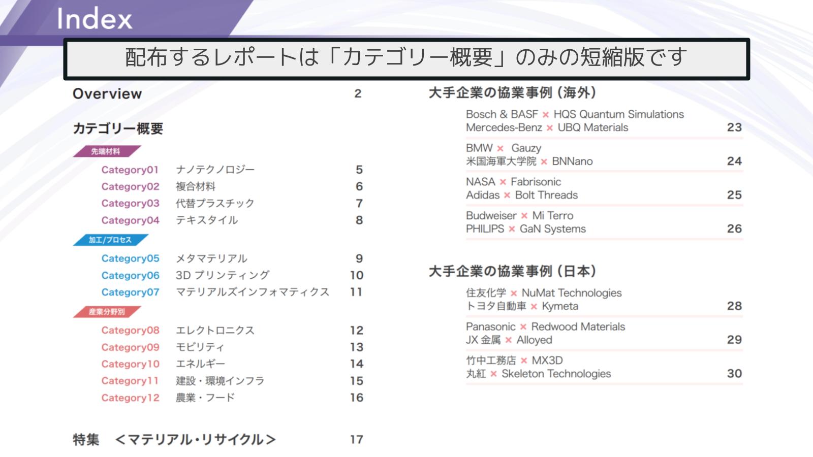 このような観点から、本レポートではマテリアル関連分野について、産業の上流から下流の流れに沿い、①先端材料、②材料の加工 / プロセス技術、③産業分野別にグループ分けして特に注目を集めるカテゴリーをピックアップし、それぞれのトレンドと有望なスタートアップ企業を掲載しました。さらに特集ページでは持続可能な社会を目指してマテリアル・リサイクルに取り組むスタートアップを取り上げています。また本レポート後半では大手企業とスタートアップの協業事例もご紹介しています。