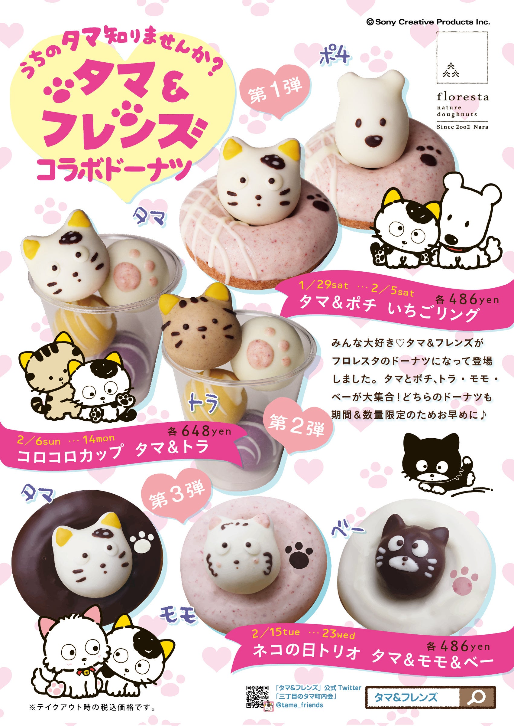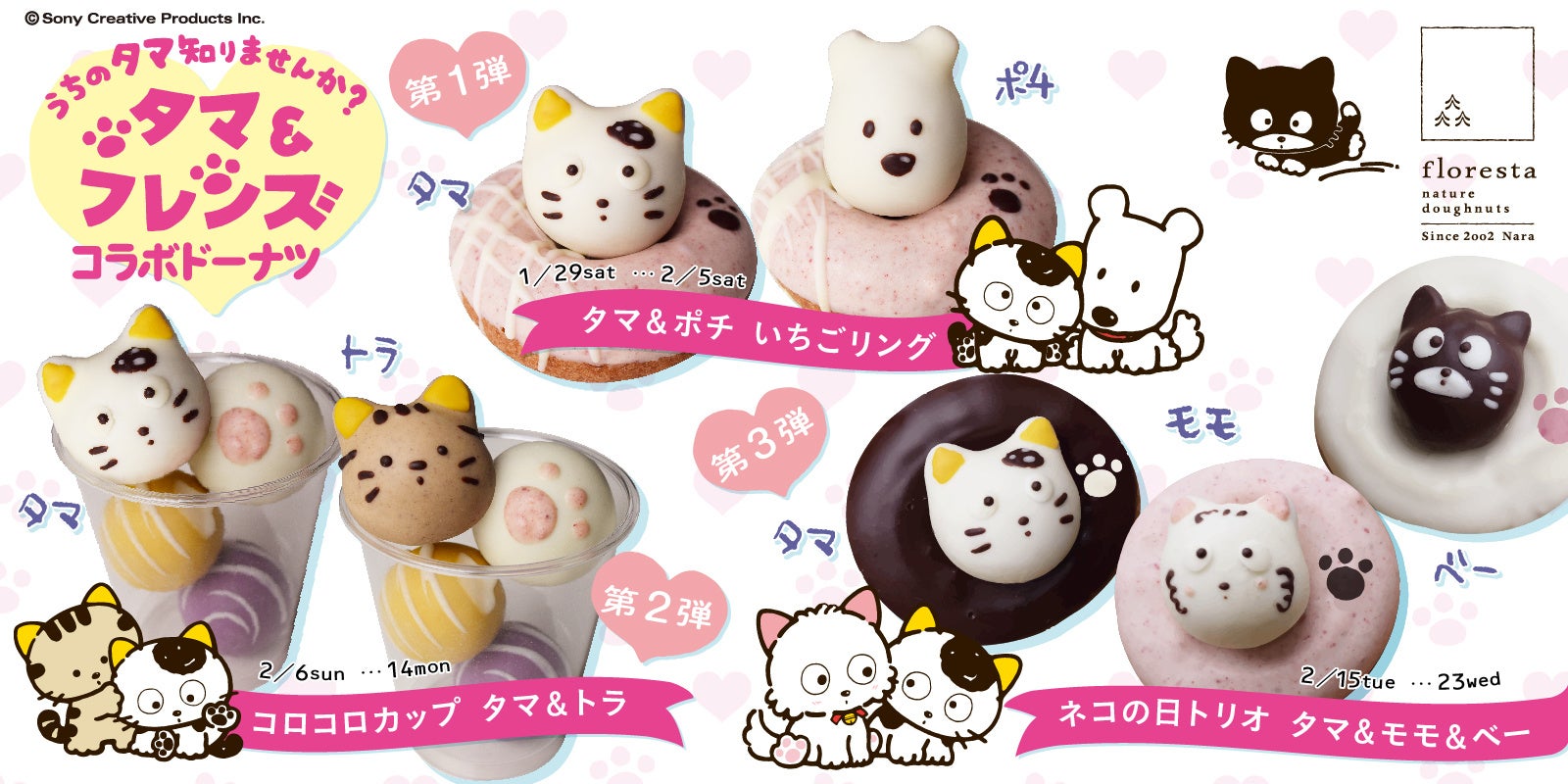 2月は、バレンタインやネコの日などイベントも盛りだくさん!からだにやさしくおいしいフロレスタのコラボドーナツで、寒い中でもとっても可愛いタマたちと一緒に今の季節を思いっきり楽しみましょう♪