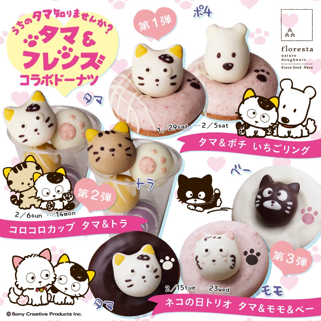 株式会社フロレスタ(本社:大阪市浪速区/代表取締役社長:辻尾吉厚)は、2022年1月29日(土)から2月23日(水/祝)の期間限定で店頭及びオンラインストアにて「タマ&フレンズ コラボドーナツ」を販売します。