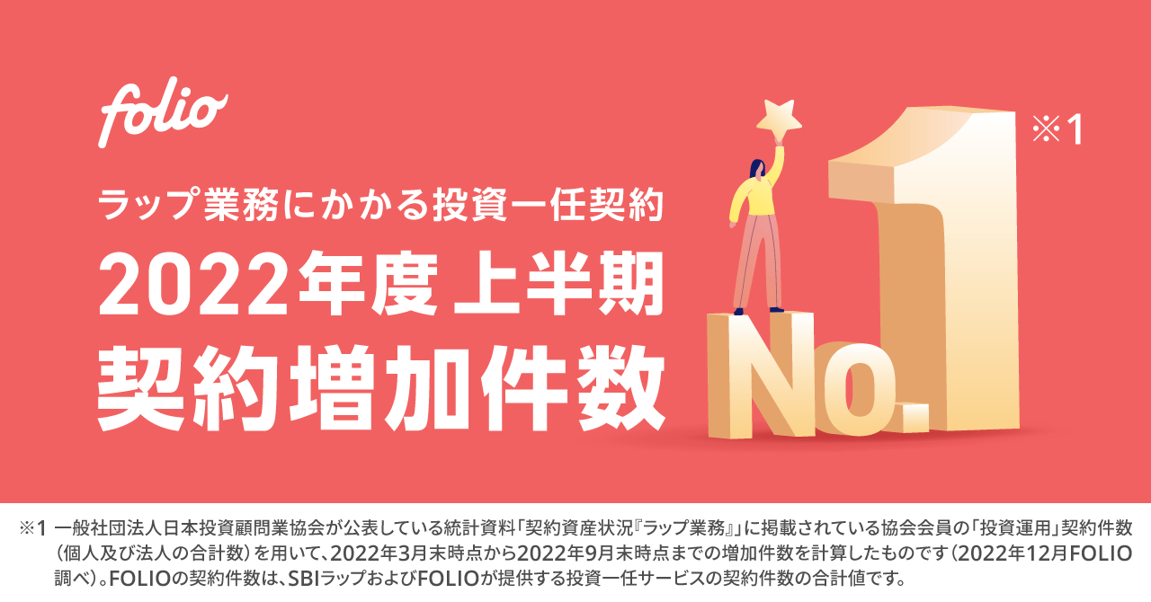 AI(人工知能)を活用したロボアドバイザー「FOLIO ROBO PRO(以下ROBO PRO)」および株式会社SBI証券(本社:東京都港区、代表取締役社長:髙村正人、以下:SBI証券)と共同開発した「SBIラップ」を提供する株式会社FOLIO(本社:東京都千代田区、代表取締役CEO:甲斐 真一郎、以下:FOLIO)が、ラップ業務にかかる投資一任契約で、2022年度上半期において契約増加件数第1位(※1)となったことをお知らせします。
