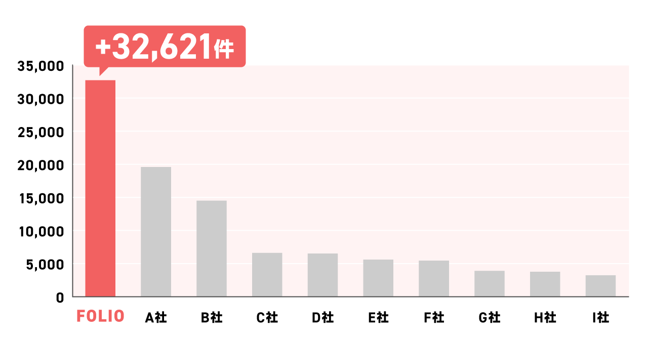 下表は2022年度上半期の「ラップ業務」にかかる投資一任契約における主要10社(※2)の契約増加件数です。FOLIOが+32,621件で第1位(※1)となりました。