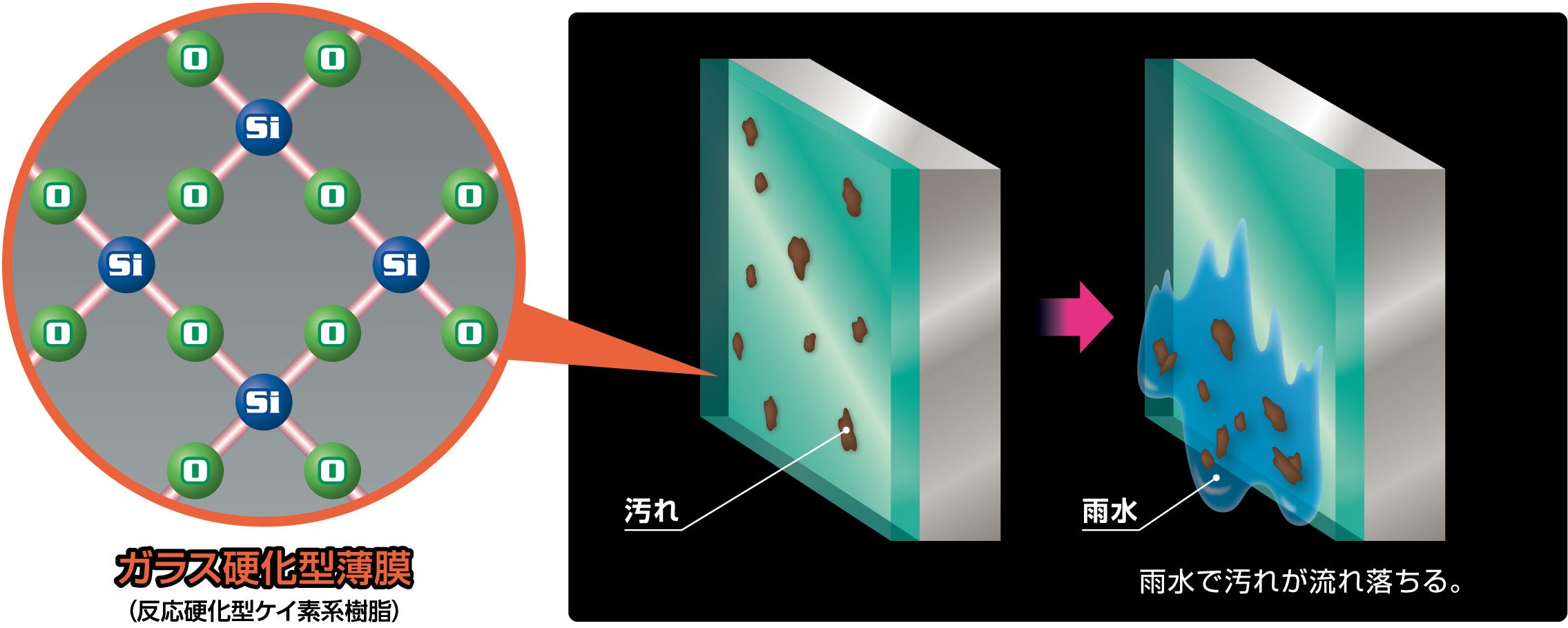 「自動車用反応型ガラス系コーティング技術」によって鉛筆硬度8H相当の高硬度なガラス系の被膜を形成し、紫外線や酸性雨などから強カにガードし、長期にわたって車体を保護します。