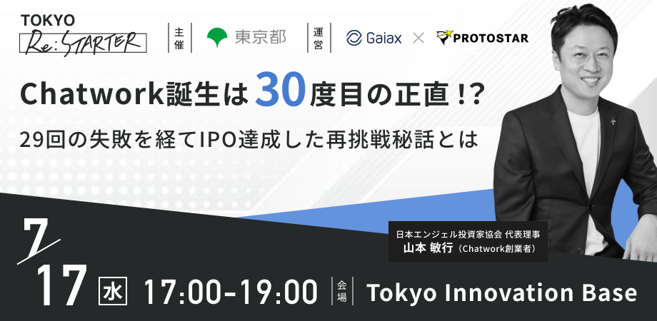 プロトスター株式会社(本社:東京都中央区 代表取締役社長:前川英麿)は、株式会社ガイアックス(本社:東京都千代田区、代表執行役社長:上田 祐司、証券コード:3775、以下 ガイアックス)が受託した、東京都「リスタート・アントレプレナー支援事業運営業務委託」において、起業家たちの再出発を支援する「TOKYO Re:STARTER(以下、本事業)」におけるコミュニティ運営を担当し、イベントの企画運営、ステークホルダーの巻き込み施策、PR全般の業務に取り組んで参ります。