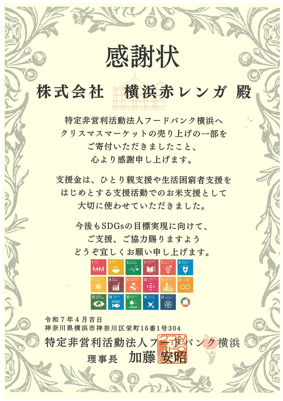 株式会社横浜赤レンガ(本社:横浜市、代表取締役 岩﨑 求起(以下、当社))は、SDGsの取組「笑う、サステナブル」活動の一環として、「Christmas Market in 横浜赤レンガ倉庫」にて限定販売したオリジナルマグカップの売り上げの一部を、特定非営利活動法人フードバンク横浜(以下、フードバンク横浜)へ寄付しました。